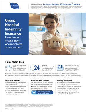 The Hospital Indemnity plan pays cash benefits from day one when you are hospitalized or receive other covered medical treatment. The plan supplements your primary medical coverage by filling the potential gaps created by rising deductibles, co-payments, and out-of-pocket expenses not covered by your health plan.